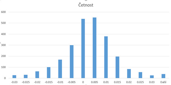 Na první pohled mě zaujme, že v daném timeframe převládají v distribuci ziskové dny nad ztrátovými (histogram je více zaplněn napravo od nuly). Také jsou zajímavé extrémní hodnoty viditelné v histogramu zcela na krajích. Obzvláště na pravé straně (tedy extrémní trendové dny) jsou četnosti zajímavé.