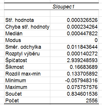 Konkrétní statistické hodnoty získáme pomocí funkce Analýza data > Popisná statistika. Bohužel jsem se ve škole se statistikou moc nekamarádil, ale naštěstí mi pro trading stačí ty největší základy.