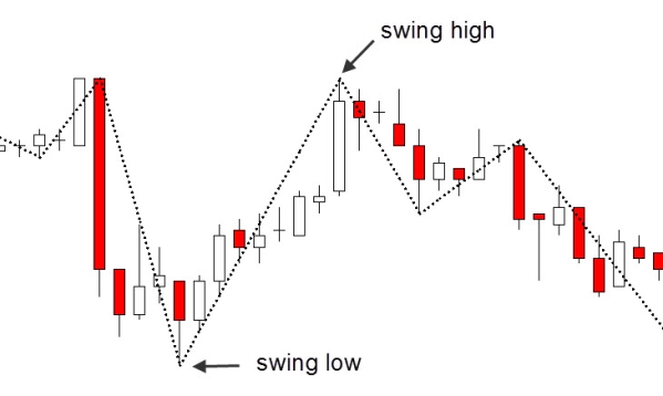 Na obrázku vidíte typický swing high (vrchol nějakého krátkodobého pohybu) a swing low (dno krátkodobého pohybu).