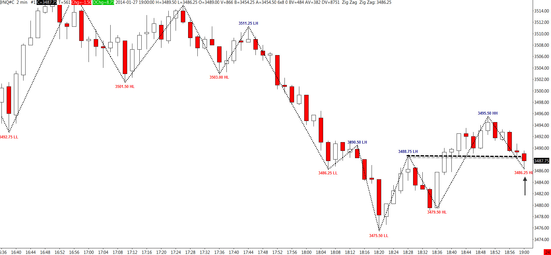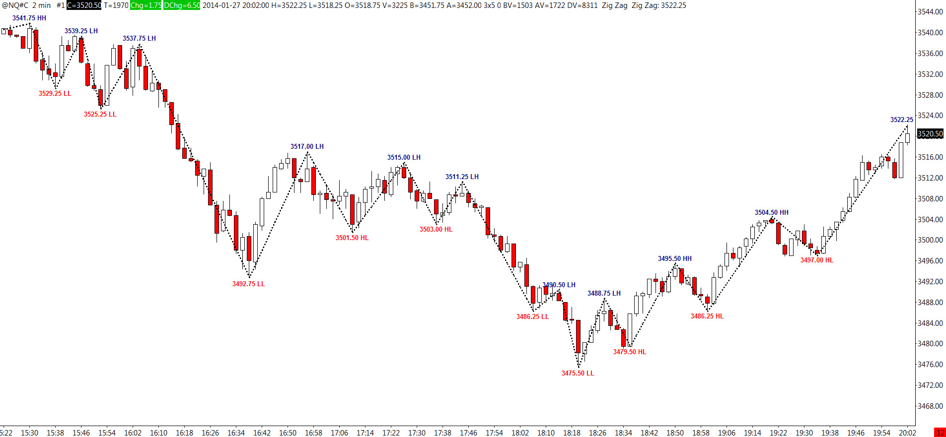 Pokud trh například silně trenduje vzhůru, vytváří často strukturu typu HH-HL-HH-HL. Tedy vrchol vyšší než předcházející vrchol následovaný dnem, které je vyšší než předcházející dno, a tak stále dokola.