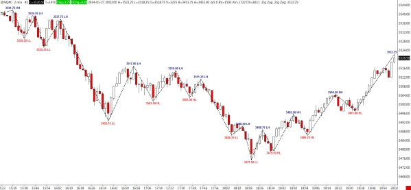 Použít lze i různá automatizovaná řešení. V Sierra Chart jde o studii Zig Zag (v ostatních programech se bude studie jmenovat většinou dost podobně).