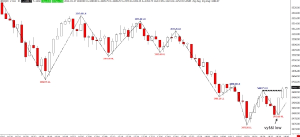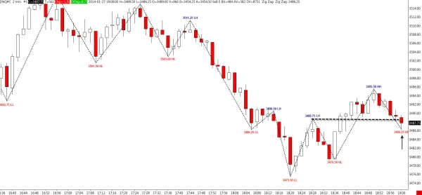 Trh NQ se pokusil zaútočit na poslední nižší low na ceně 3475.5, ale neměl sílu oblast prorazit – ani se k ní přiblížit. Prodávajícím došla síla a trh začínají ovládat nákupy. Jednak obchodníků likvidujících své shorty (vybírání profitů) a současně prvních traderů spekulujících na růst.