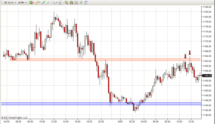 Před začátkem obchodování jsem měl v grafu zakreslené S/R zóny v oblasti 1162-1163 pro short a 1144-1145 pro long. Plus samozřejmě další úrovně mimo tento pás. Kolem 9 hodiny českého času se ES pohybovalo u horní zakreslené zóny a já se začal mentálně připravovat na to, že budou-li splněné podmínky mého obchodního systému, mohl bych v S/R zóně obchodovat short. Zobrazený graf je pro přehlednost 15ti minutový, takže odmítnutí S/R zóny vypadá jako „nepodstatné“, ovšem na nízkém timeframe jde o potenciální stovky dolarů na kontrakt. První vstup se nakonec obrátil po cca 200 dolarovém pohybu a s částí kontraktů jsem vystoupil B/E, proto jsem vstoupil do obchodu ještě jednou (dokonce na lepší ceně), přičemž tento obchod již nabídl velmi slušný range s RRR více než 1:5).
