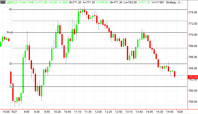 Na následujících několika grafech jsou uvedené screenshoty intradenních průběhu trhu e-mini Russel 2000 posledních několika dnů. Je důležité si uvědomit, že pivotů uvedené v grafu vycházejí z close, low a high předchozího dne, tzn. tyto hodnoty jsou dané již před otevřením trhu a nejde o výpočty v průběhu obchodního dne. A přesto mohou tyto „oblasti odporu“ fungovat velice dobře. Stejně jako s jinými S/R úrovněmi, konkrétní využití záleží na strategii každého obchodníka.