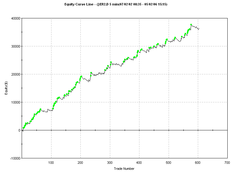 A zde jsou výsledky systému aplikované na posledních 1000 obchodních dnů v trhu ER2 v programu TradeStation: