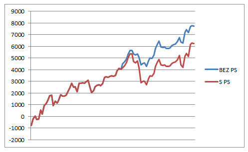 Jak je vidno, červená křivka, na kterou byl aplikovaný position-sizing, si vedla nejenom hůře (i když jsem čekal alespoň o 20-30% lepší výsledek, než při obchodování jediného kontraktu), ale navíc ještě i vykázala výrazně vyšší drawdown v bodě, kde bych s jediným kontraktem měl drawdown poloviční. Toto přeci není žádné zlepšení! Poznatek mě trápil o to více, že při diskréčním obchodování fungoval position-sizing vždy vcelku spolehlivě.