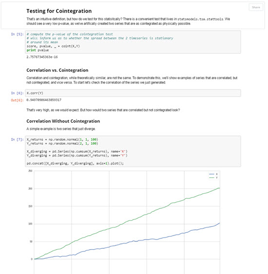 Lekce jsou často připraveny v jupyter notebooku, kde je možné krok za krokem spouštět jednotlivé Python příkazy a sledovat jejich dopad na výsledek. Takto například vypadá notebook vysvětlující programování statistických arbitráží: