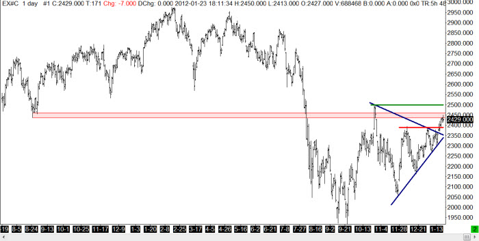Na grafu vnímám mimo jiné přibližně následující: trh překonal hranici trojúhelníku (modré linky), které v předcházející dny byly sami o sobě velmi zajímavou oblastí pro sledování. Současně trh na denním grafu uzavřel nad high výrazných swingů (červená linka) a tak pochopitelně v grafu hledám vodítka pro další úrovně, které by mohly cenu v budoucnu odmítnout (ať už pro plánování vstupů nebo výstupů). Z grafu se nabízí cena kolem 2450 kde je silná S/R úroveň vycházející z low historického swingu (červený pás) a následně úroveň kolem ceny 2500 (zelená linka) kde cena byla odmítnutá na high historického swingu (pozn. uváděné cenové úrovně vycházejí z kontinuálního kontraktu se zpětně adjustovanými cenami, který pro dlouhodobé analýzy používám). Taková analýza samozřejmě zatím vůbec neznamená, zdali v následující dny v rámci některé intradenní seance vydělám, ale jsem přesvědčen o tom, že velmi pomáhá koncentrovat naši mysl na aktuální celkovou situaci v trhu.
