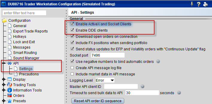 Pokud chceme připojit jakýkoliv program k brokerovi InteractiveBrokers (IB), musíme nejprve otevřít platformu IB TWS a povolit v ní, že ostatní programy mohou čerpat data. To uděláte jednoduše. Klikneme na CONFIGURE a vyberme položku API => SETTINGS. Následně zaškrtneme první dvě nabídky: