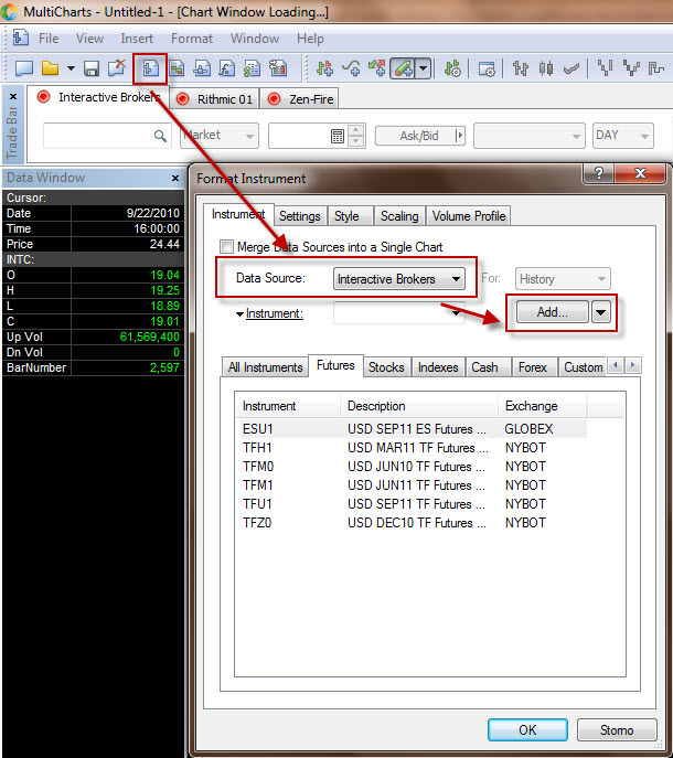 Nyní otevřeme program MultiCharts. Klikneme na ikonku, která slouží k otevření nového grafu (viz obrázek), v DataSource (zdroj dat) vybereme InteractiveBrokers a klikneme na tlačítko ADD, které slouží k přidání trhu, jehož graf chceme otevřít, do seznamu "rychle dostupných" trhů v platformě MultiCharts.