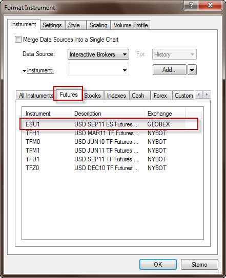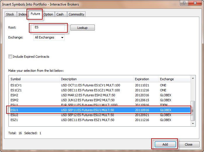 Následně se objeví okno, které slouží k rychlému a snadnému vyhledání daného trhu. Pokud chceme například zobrazit aktuální graf trhu e-mini S&P, pak klikneme na záložku Future, do okénka napíšeme zkratku trhu (ES) a klikneme na tlačítko Lookup. Pokud je vše správně propojené, MultiCharst nyní vyhledá veškeré dostupné kontrakty ES u InteractiveBrokers a zobrazí níže. Aktuálně obchodovaný je kontraktní měsíc ESU1, který tedy vybereme a klikneme na tlačítko ADD.