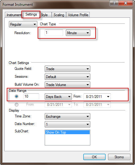 Nyní zbývá nastavit druh grafu a timeframe, což uděláme kliknutím na záložku Settings.