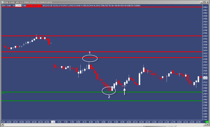 Druhý plán byl long z oblasti zelené S/R úrovně. Trh se jen lehce dotkl horní úrovně na 2405 (bod 2) a já se tak mohl začít připravovat na obchod směrem vzhůru. RRR obchodu byl dostatečný a současně jsem měl „pod sebou“ poměrně silnou S/R úroveň, která mi nabízí i možnost ukončit obchod na malém stop-lossu, pokud by se situace nevyvíjela příznivě. Pochopitelně, že v takové situaci už do hry vstupují nuance obchodního plánu. Já osobně čekal ideálně na intermarket divergeci a nakonec jsem vstoupil na ceně 2410 na základě jednoho z cenových patternů potvrzených vývojem v cenovém grafu. První target jsem cílil cca 10 ticků od vstupu (tj. 100 euro na kontrakt), zbývající část pozice k horní S/R úrovni. Pozici jsem obchodoval menší, protože vstup nebyl úplně ideální (představoval bych si jej blíže k S/R úrovni). Každopádně detaily konkrétního obchodu nejsou v tomto výkladu podstatné a pochopitelně, že tento stručný popis nepředstavuje kompletní obchodní plán. Ovšem popis je zcela konkrétní v hlavních obrysech, ve kterých k obchodování tohoto trhu přistupuji.