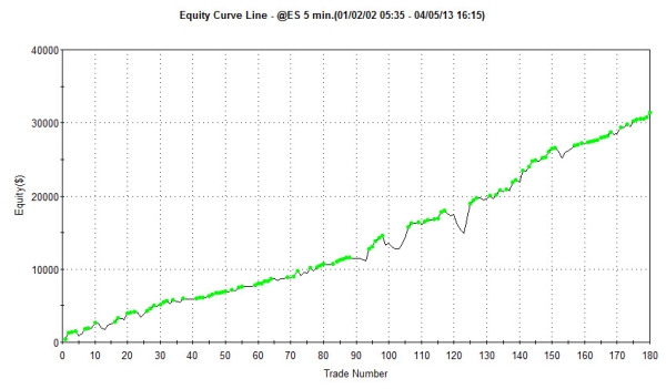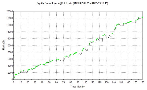 Pojďme si vše vysvětlit na konkrétním příkladu. Řekněme, že bych obchodoval pouze jeden pattern a na základě historických backtestů použil fixní stop-loss 350 USD. Equity křivka systému by pak při obchodování jednoho kontraktu vypadala následovně: