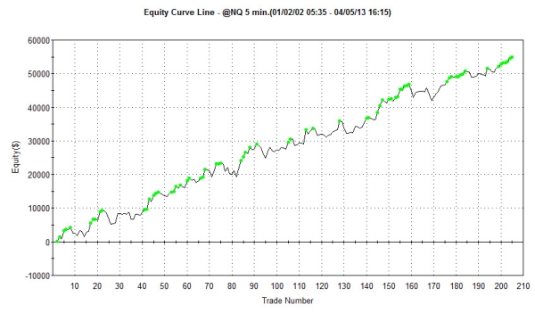 Pokud stejný systém bez jediné úpravy aplikuji na trh e-mini Nasdaq (NQ) získám následující equity křivku: