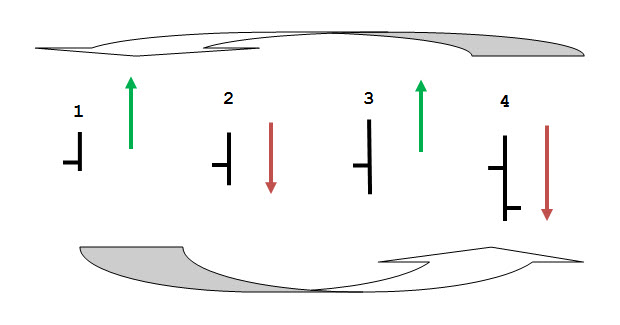 Nejcharakterističtější pro „tekoucí“ úsečky je stav, kdy úsečka během vykreslování udělá nové low o velikosti několika ticků a záhy se vrátí výše jenom na malou chvilku a jenom o malý kousek – řekněme 3-4 ticky – aby opět zaútočila na své low a vytvořila na něm nové hodnoty. Celý tento proces skutečně nejlépe vystihuje slovo „tekoucí“, s trochou citu a zkušeností již sami poznáte, o čem je řeč.