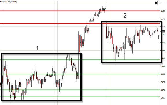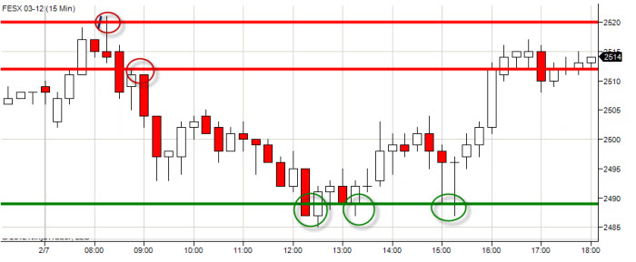 Zde je například graf trhu FESX, jak jsem jej viděl dnes před otevřením trhů (článek připravuji v úterý 7.2.2012) a jak jsem S/R úrovně publikoval na Twitteru před obchodní seancí. Na screenshotu připraveném pro tento článek je vidět 10ti minutový timeframe, který mi poskytl tak akorát úseček pro zobrazení do screenshotu.