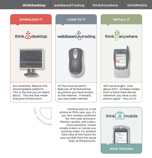 Samotná platforma existuje v několika podobách, takzvaná „stand alone“ (pod názvem ThinkDesktop), web-based verze (WebBasedTrading), PDA verze (ThinkAnywhere) a mobilní verze (ThinkMobile).