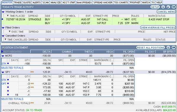 Řádka „Working orders“ nám ukazuje právě pracující příkazy, čekající na vyplnění. V této ukázce jsem tedy zadal do platformy nákup opčního Straddle v trhu SPY se strike 147 na obě opce (nejedná se o žádný plánovaný obchod – pouze náhodnou ukázku pro účely tohoto seriálu). Příkaz je zadaný ve formě STOP na ceně 7.25 (o příkazech v dalších dílech), aktuální cena na trhu za tento Straddle je 6.425.