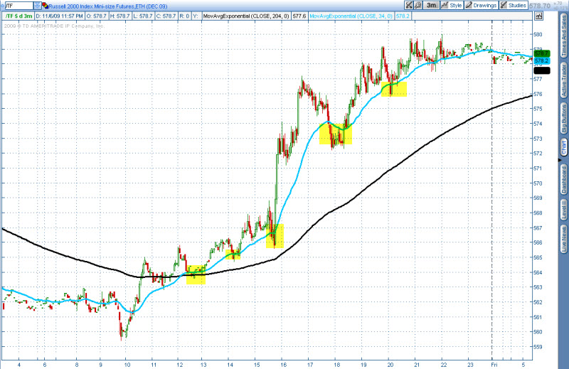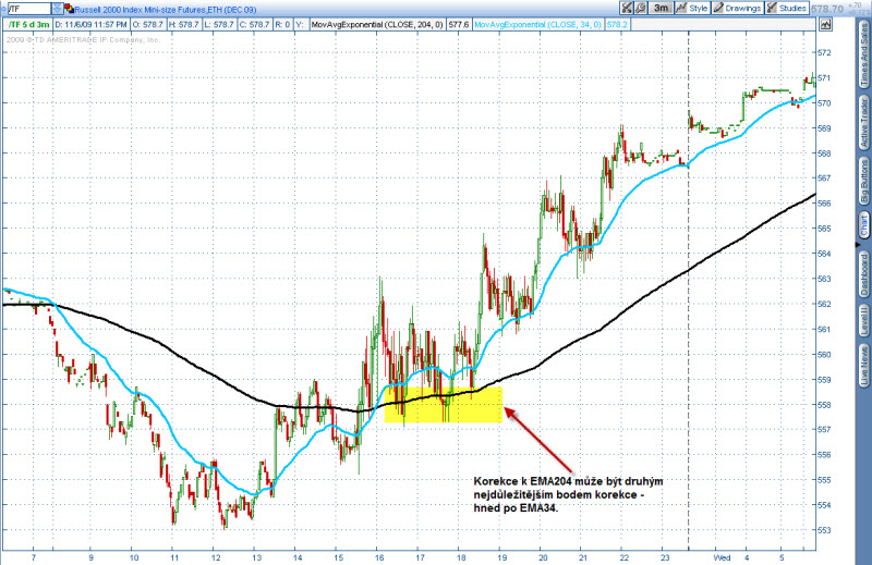 Na prvním obrázku vidíte intradenní seanci trhu e-mini Russell 2000 (TF) v podobě 3 minutového grafu. Žlutými boxy jsem označil veškeré korekce v nově započatém uptrendu. Jak je z obrázku patrné, všechny z nich se odehrávaly do úrovně těsné blízkosti EMA34 - pokud bychom tedy hledali potenciální vstupy právě v těchto oblastech (s jemným časováním vstupů, například s pomocí patternů FinWin na indikátorech CCI), v konečném důsledku bychom jednali velmi rozumně a v souladu s trhem.