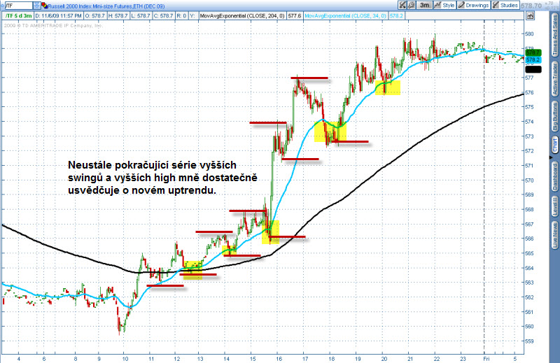 Samozřejmě, logicky můžete namítat, že podobné obrazce skvěle fungují v trendujícím trhu, nikoliv v chopu, neboli v době, kdy jde trh do strany. To je naprostá pravda - je však nutné říci, že v chopu vám nebude spolehlivě fungovat vůbec žádná technika - proto se zde neustále učíme, jak je důležité stát v chopu zcela stranou. A na druhou stranu, abychom mohli spolehlivě určit, že trh již není v chopu a začíná trendovat, můžeme si vypomoci technikou zakreslování postupně se tvořících swingů - pokud jsme schopni jasně identifikovat, že trh tvoří neustále vyšší swingy / vyšší high, pak můžeme velmi rychle předpokládat, že nastal okamžik, kdy opět můžeme důvěru svěřit v indikátor EMA34 a v jeho blízkosti začít tedy vyčkávat na korekce do uptrendu. Zde názorný obrázek se zakreslením postupně se tvořících swingů: