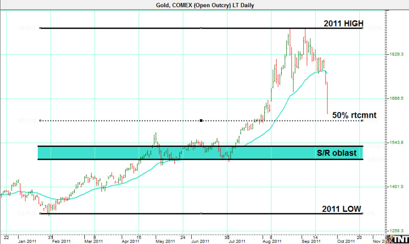 Poslední týdny zlato reagovalo přesně opačně, než by mělo. Na negativní ekonomické zprávy reagovalo většinou poklesem. Neumím si představit, že by ještě před měsícem zlato po zprávě snížení ratingu Itálie padalo dolů. Při podobných zprávách zlato zásadně tvořilo nové high. Opačná reakce jasně dokazuje, že zlato už nemá momentálně kam dále růst a že v trhu začínají vládnout prodejci - a to poměrně silně. Při troše studia není možné opominout, že podobně se obvykle chovají trhy na začátku splasknutí bubliny.