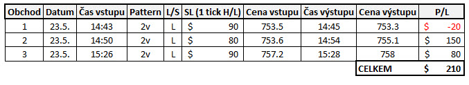 Obchod číslo 1 je klasickou ukázkou trendového patternu dle mých pravidel. Odražení od EMA34, pattern 2v a dostatečný prostor k high dne (HOD). Trh se bohužel příliš nerozjel, výstup by byl o 2 minuty později.