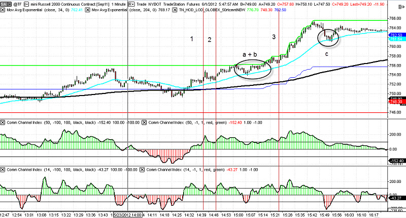 Obchod číslo 3 je poslední zajímavý obchod daného dne. Trh se sice o chlup ne úplně dotknul EMA34, ale trading není exaktní věda a daleko zajímavější je skutečnost, že trh výrazně trenduje vzhůru a má za sebou nové high dne - jasná vůle trhu směrem nahoru. Uspokojivá je i struktura swingů. Prostor k high dne není světoborný, ale je dostatečný k posunutí SL. Pata "véčka" na úrovni 100 na CCI14 nevadí, v případě silně trendujících trhů má pravidla tuto podobu umožňují.