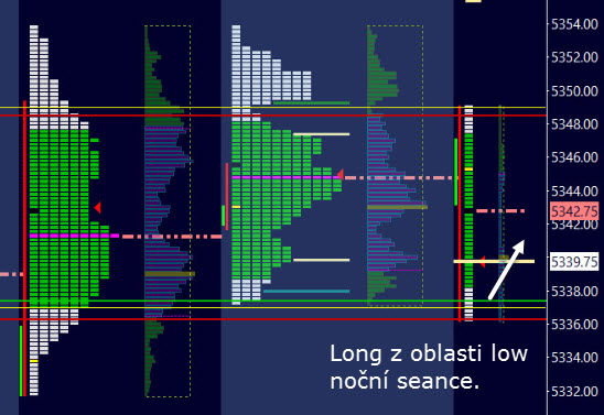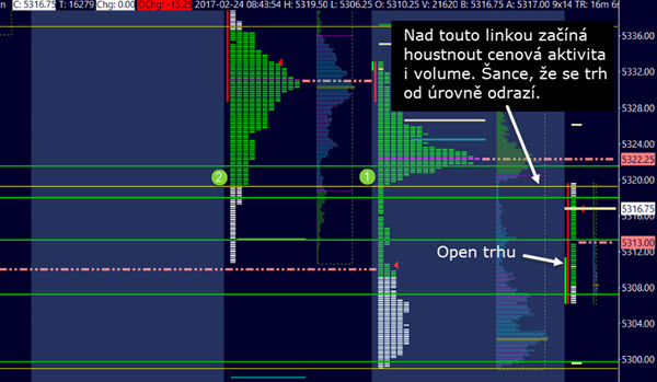 Shodou okolností je to výše zmíněný singl, který ale odpovídá i zajímavé úrovni ze čtvrtečního obchodního dne (tzv. „Value Area Low“ – spodní hrana oblasti, ve které se daný den pohyboval trh 70 % času). Laicky řečeno – žlutá linka odděluje místa, kde se trh obchodoval méně, a kde hustě. Při přechodu podobných úrovní lze očekávat odpor = S/R úroveň.