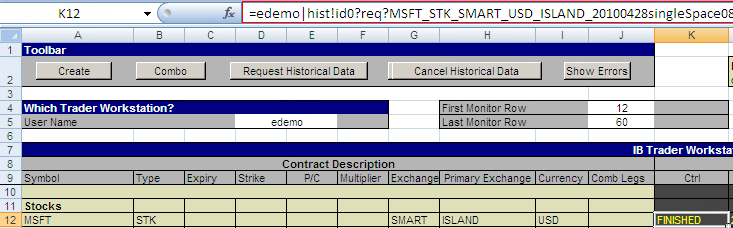 Nyní už víme všechno, co potřebujeme, abychom si mohli naprogramovat jednoduchý XLS, který nám načte historická data pro jeden titul. Program bude mít 3 vstupní parametry - uživatelské jméno TWS, jméno akciového symbolu a hloubku historie dat. Budeme předpokládat, že historii chceme ode dneška a budeme chtít denní timeframe. V jedné části programu si vytvoříme control link a v druhé části budeme monitorovat jeho hodnotu a jakmile se změní na „RECEIVED“, načteme si data z TWS a vypíšeme si je do Excelu.