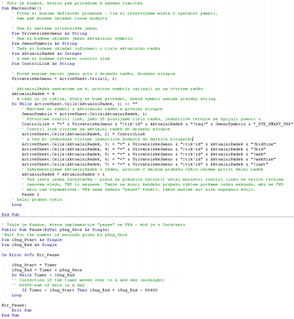 Cílem článku není poskytnout kompletní návod programování ve VBA. Cílem je okomentovat základní princip propojení Excelu s Interactive Brokers. Nebudu zde tedy rozebírat samotné principy programování. O VBA toho na Internetu najdete víc než dost.