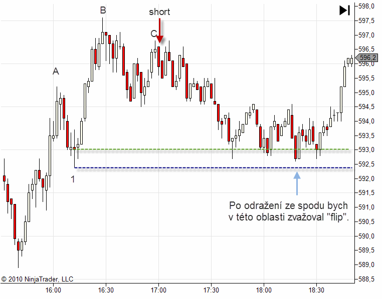 Vstupní signál do formace jsem dostal na close červené úsečky v 17:00 (GMT časová zóna). Trh měl silné momentum, nebyl prostor pro lovení lepší ceny – nastoupil jsem za uzavírací cenu vstupní úsečky. Cena se okamžitě rozjela mým směrem do otevřeného profitu 5 ticků (50 USD v trhu TF). V tu chvíli se však „zasekla“ přesně na low vstupní úsečky. Trh úroveň několikrát otestoval a začal se vracet zpět. Nechal jsem obchodu trochu prostoru, abych viděl, jak se cena bude chovat v oblasti close vstupní úsečky (přeci jen na posunutí stop-lossu na B/E jsem neměl ještě dostatečný profit). Chování trhu mně napovědělo, že momentum směrem dolů se aktuálně z trhu vytratilo. Pozici jsem ukončil se ztrátou -20 USD/kontrakt (plus komise, ta aktuálně u IB činí 3,60 RT/kontrakt). Mohl jsem „doufat“, že se cena obrátí (ostatně také se obrátila, SL jsem měl samozřejmě nad high swingu), ale to znamená, že jsem také mohl vystoupit se ztrátou 150 USD/kontrakt, což je podstatný rozdíl a především – vývoj situace bych neměl pod svojí kontrolou. Jinak řečeno – pokud mě obchod nepřesvědčí od samého začátku, tak se jej snažím utnout s minimální ztrátou a přesunout se k další příležitosti.
