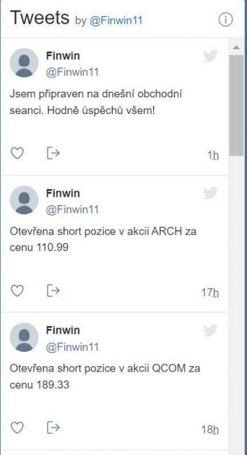 Na účtu je vidět nejprve short v QCOM za cenu 189.33 v 15:38:14 a následně short v akcii ARCH v 15:55:56 za cenu 110.99. Přesně, jak jsem v reálném čase reportoval na Twitteru. Pozice byly uzavřeny s uzavřením burzy – ve 22:00 českého času. Zisk si můžete spočítat sami nebo vzít ten z mé brokerské platformy – tyto dva obchody mi včera na účet přinesly 1 145,40 dolarů, tedy cca 24 000 Kč. To znamená, že sám dnes obchoduji Finwin s výrazně vyšším účtem než 20 000 dolarů – postupem času jsem pozice navyšoval.