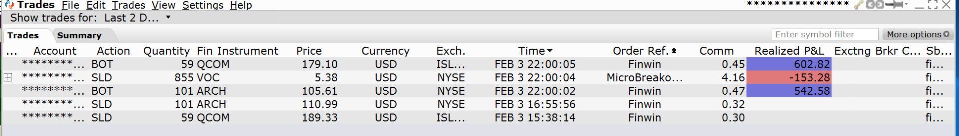 Systém shortoval dvě akcie – ARCH a QCOM. A takto vypadá plnění z mého účtu u Interactive Brokers: