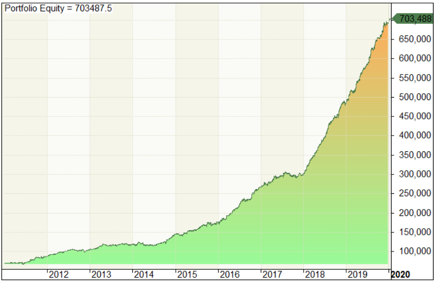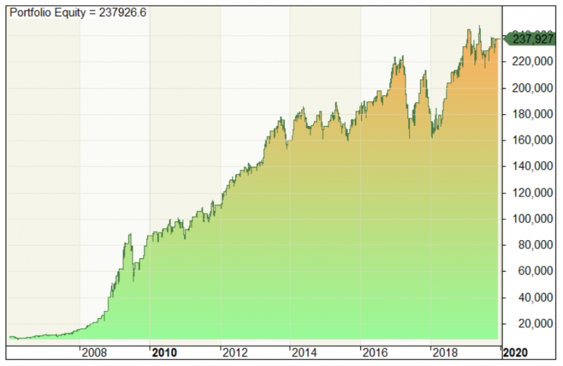 Takto pro ilustraci vypadá hrubý backtest mého aktuálně obchodového portfolia, kde pracuji současně s 10 páry.