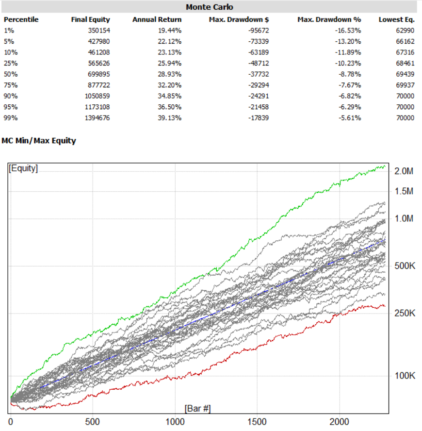 Výsledná equity křivka vytváří větší množství velmi stabilních výsledků (systém obchoduje s vysokou úspěšností 76 % a RRR blízko 1:1). Není divu, že velmi zajímavě vypadá risk i z pohledu monte carlo analýzy: