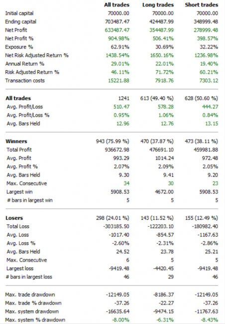 Na portfolio páru aplikuji úplně stejný kód, který je popsán výše. Systém tak obchoduje na dlouhou i krátkou stranu a obchody jsou na obě strany velmi pěkně vyrovnány: