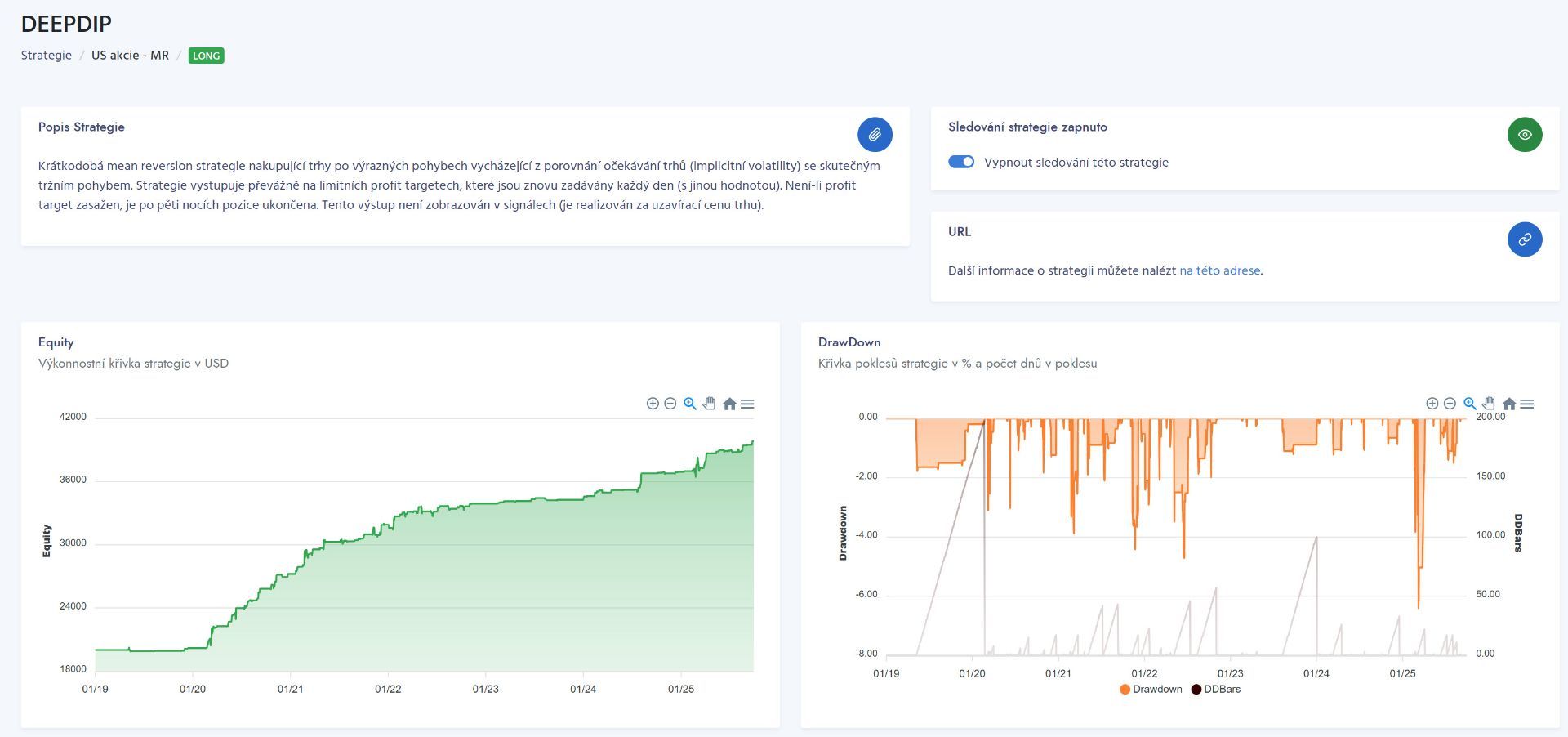 Krásnou výkonnost má například Deep Dip - long mean reversion časovaný pomocí implikované volatility. Podrobně jsem o systému psal na Finančníkovi v článku Časování návratu k průměru pomocí implikované volatility.