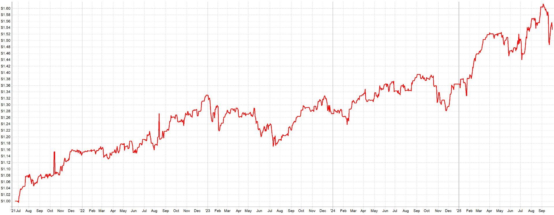 Ten obchodujeme od května 2024 a takto aktuálně vypadá ekvity křivka se sdílenými pravidly: