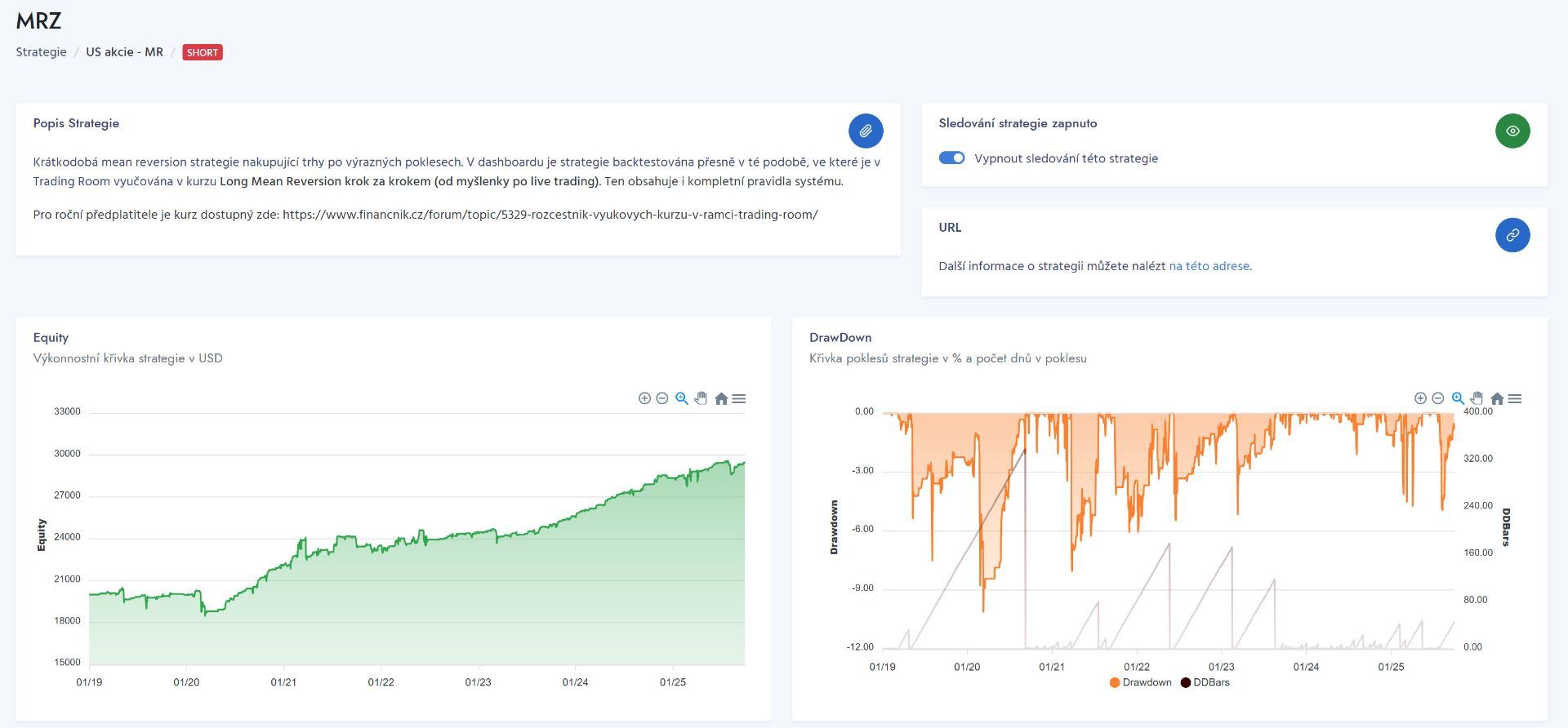 Zelená – backtest nově postavené long mean reversion strategie MRZ, která je v Trading Room vyučována se všemi pravidly: