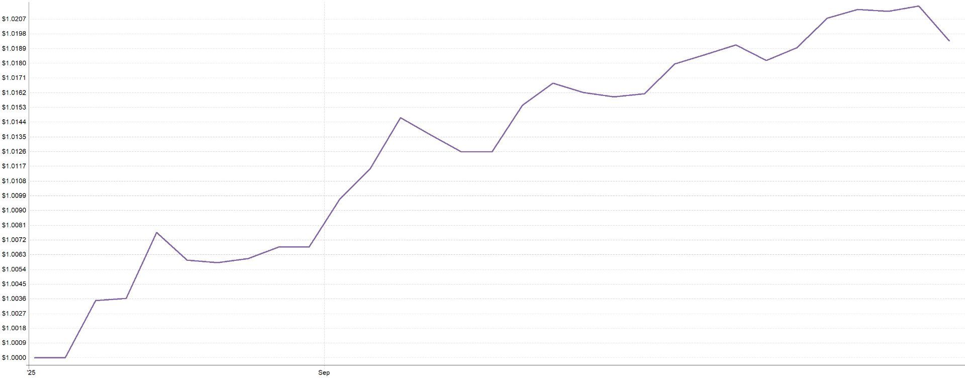 Sám jsem strategii ihned po dokončení spustil na živém účtu. Mám za sebou 11 obchodů se ziskem přes 2 000 dolarů a úspěšností 81,82 %. Takto vypadá má dosavadní živá ekvity křivka: