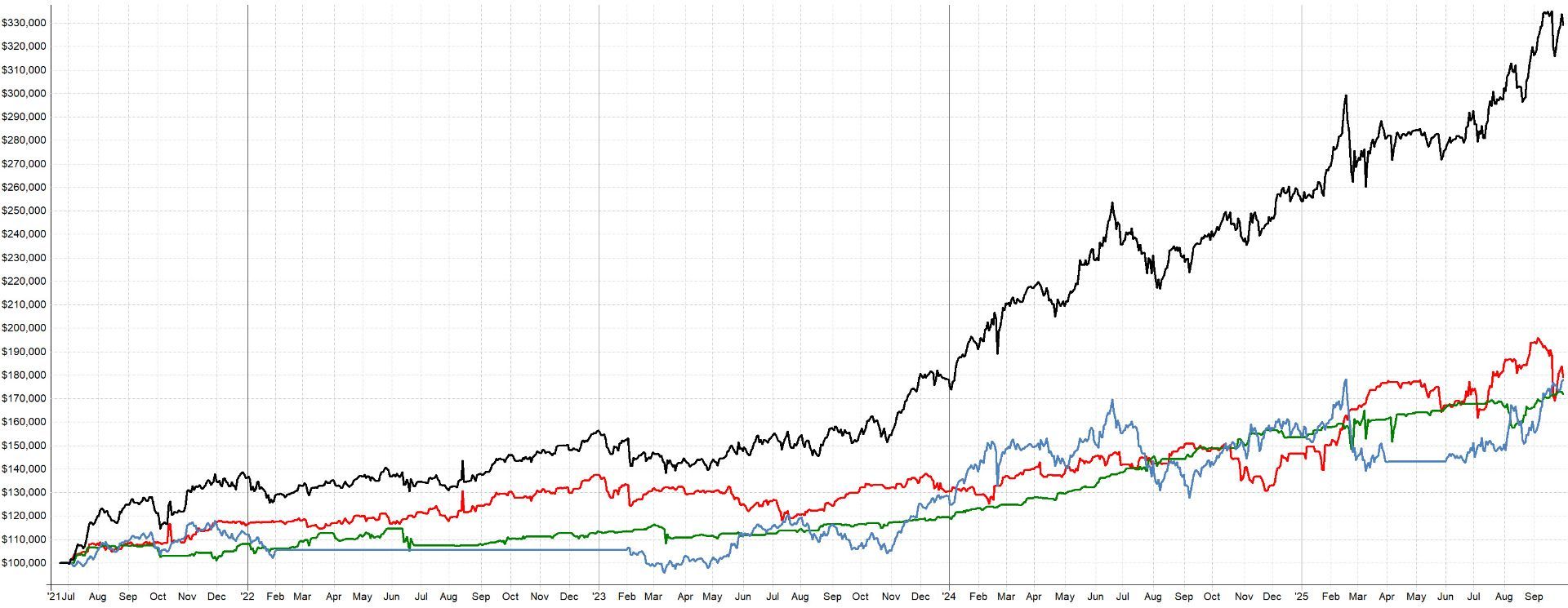 Pro inspiraci – takto vypadá ekvity křivka portfolia (černá křivka) složená ze tří systémů: