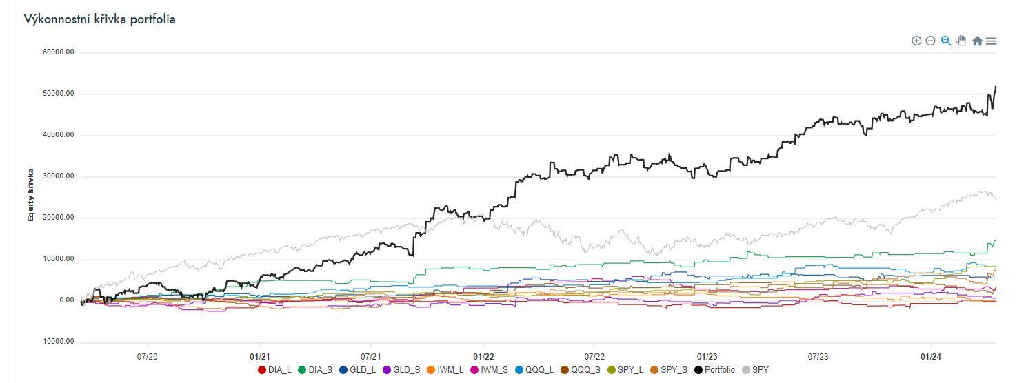 Takto například vypadá portfolio na indexech SPY, IWM, QQQ, DIA a GLD (tedy různé akciové indexy a zlato), na kterých jsem sám vyvinutý breakout portfolio systém pustil: