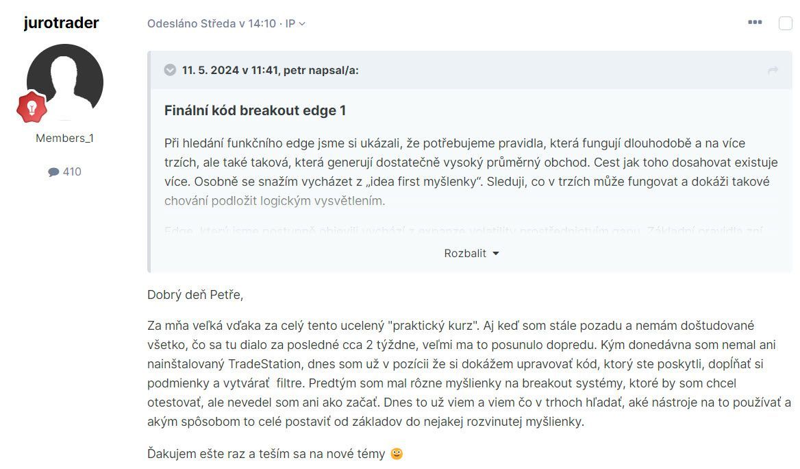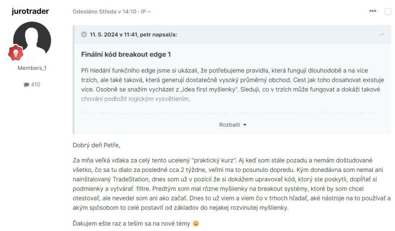 - Zbacktestovaný obchodní plán breakout strategie + jasná pravidla pro systematické obchodování do budoucna.