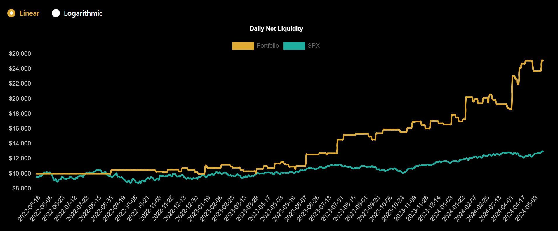 Rámcově historické výsledky indikují roční zhodnocení 36,5% při max. drawdownu -17,1% a sharpe ratio 1,51 (při započtení komisí).