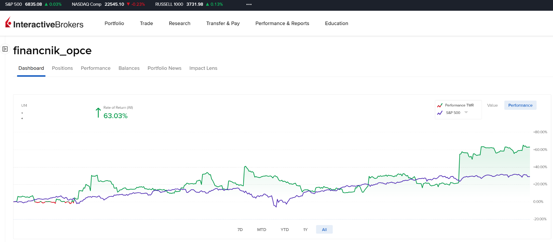 Strategii jsme v Trading Room implementovali i pro obchodování 0TDE opcí. Strategie opce nakupuje - tj. risk je limitován jen cenou opce. Vše je plně automatizované (a autotrader je sdílen zdarma v Trading Room). Strategie je spustitelná na malém účtu a sám jsem ji začal obchodovat na účtu s počátečním kapitálem 10 000 dolarů. Od spuštění mně strategie vydělala 63 %. Zde je screenshot přímo z brokerské platformy - modrá křivka je pro porovnání výkonnost buy and hold S&P 500: