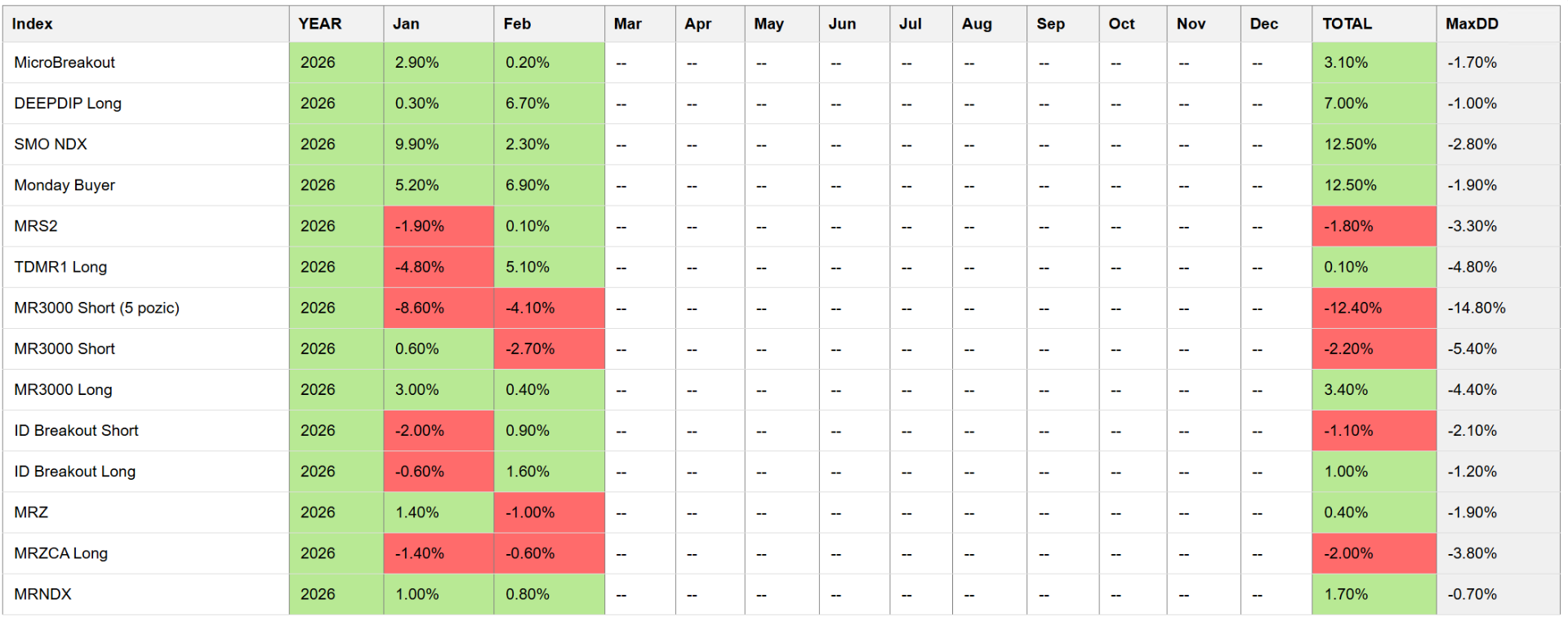 V tabulce je zobrazen komplexní výstup z aktuálního dashboardu Trading Room. Smyslem není obchodovat všechny strategie najednou, ale použít jednotlivé komponenty do portfolií, které v Trading Room diskutujeme.