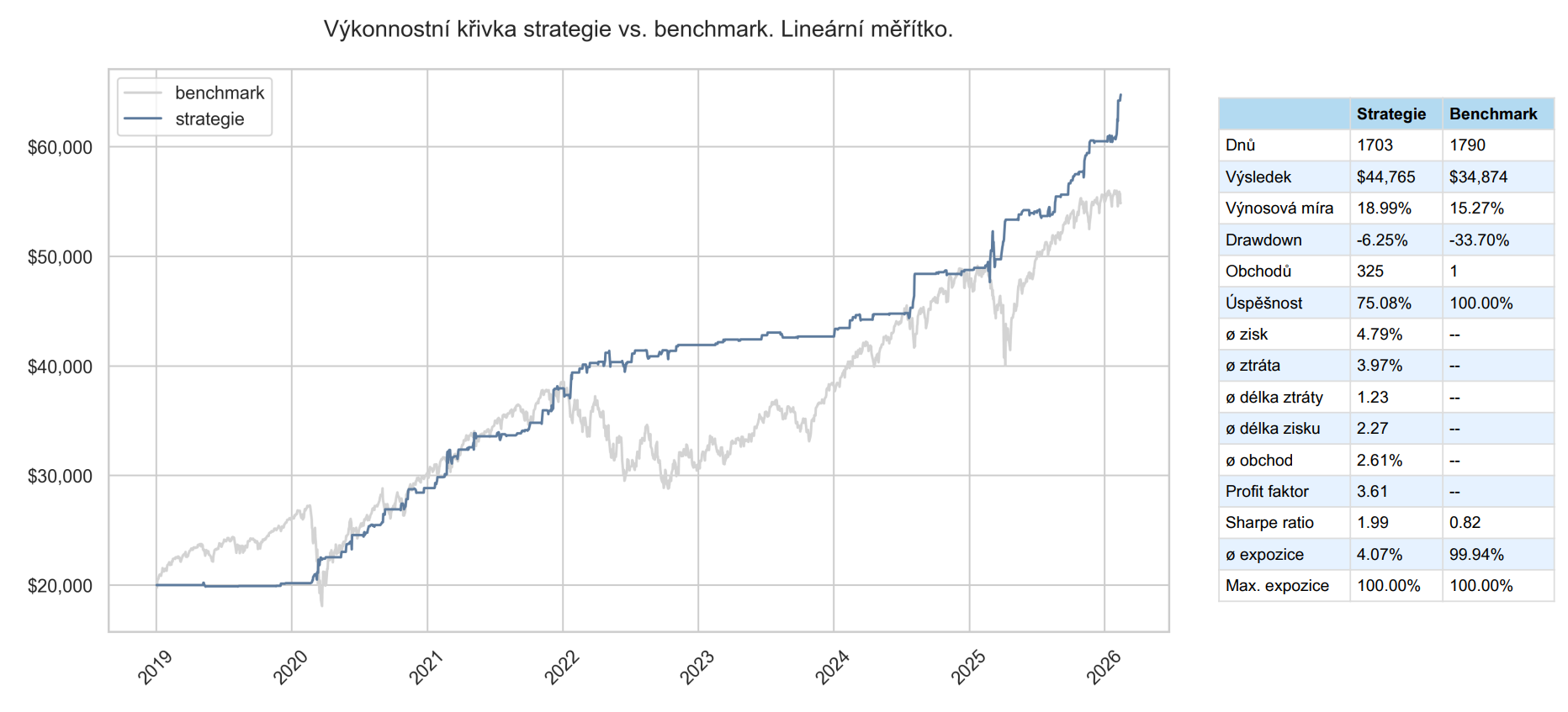 Takto vypadá průběžně aktualizovaný backtest strategie v dashboardu: