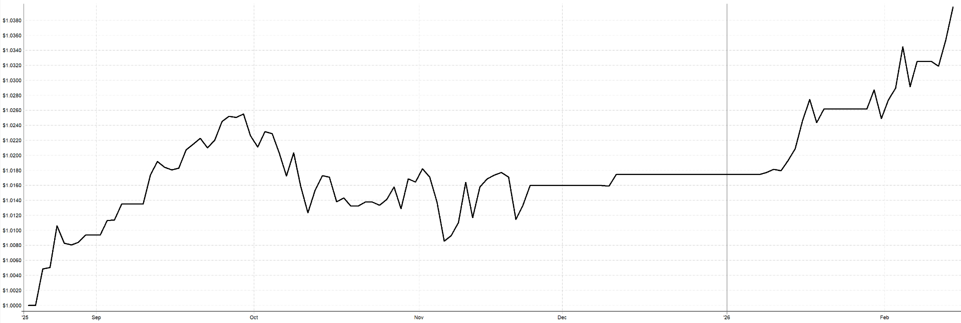 Takto vypadá "out of sample" průběžný backtest od oficiálního spuštění strategie v Trading Room. Jde o equity křivku vytvářenou se shodnými pravidly, jako jsou popisovány v implementačním programu: