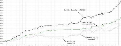 Nejlépe se to demonstruje na příkladu, kdy spojíme dvě strategie - long mean reversion DeepDip + rotační momentum SMO NDX (viz článek Co jsou zač rotační momentum strategie?)